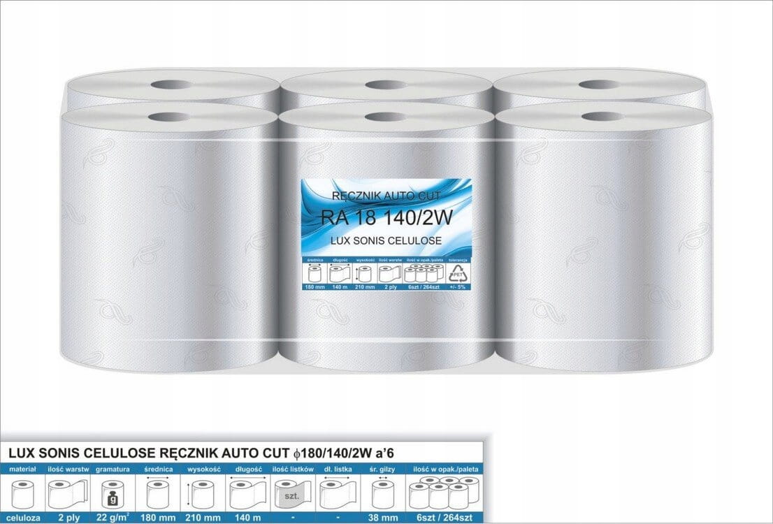 Ręcznik do automatycznych dozowników AutoCut. Ręcznik o długości 140m wykonany z najwyżej jakości celulozy doskonale sprawdza się w miejscach o dużym natężeniu ruchu. Dwuwarstwowy, śnieżnobiały znakomicie chłonie wilgoć z rąk i powierzchni.