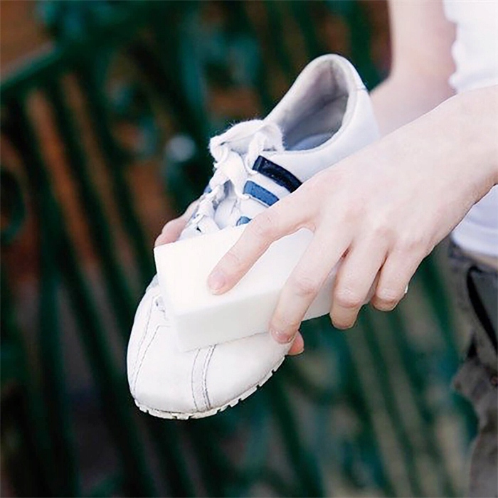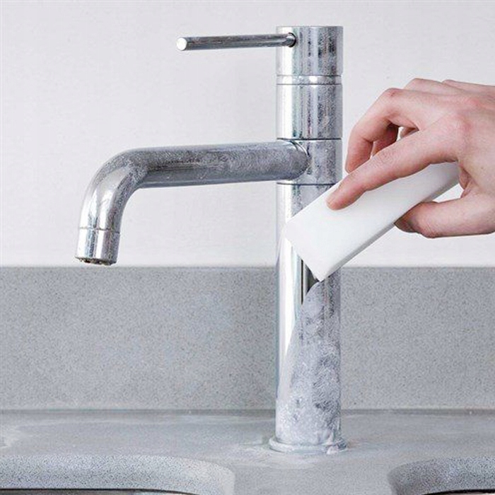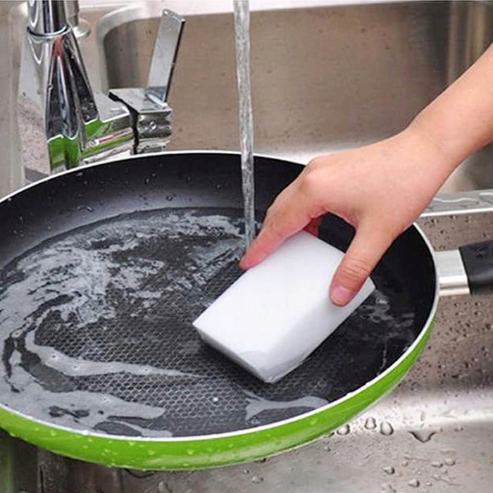 Gąbka z innowacyjnego materiału wykorzystywanego w akcesoriach do sprzątania – pianki melaminowej. Ekonomiczny materiał do wielokrotnego użytku o wysokiej chłonności i wytrzymałości. Nie posiada porów powodujących spienianie, materiał delikatny dla skóry dłoni. Wykonana w procesie minimalizującym uszkodzenia.